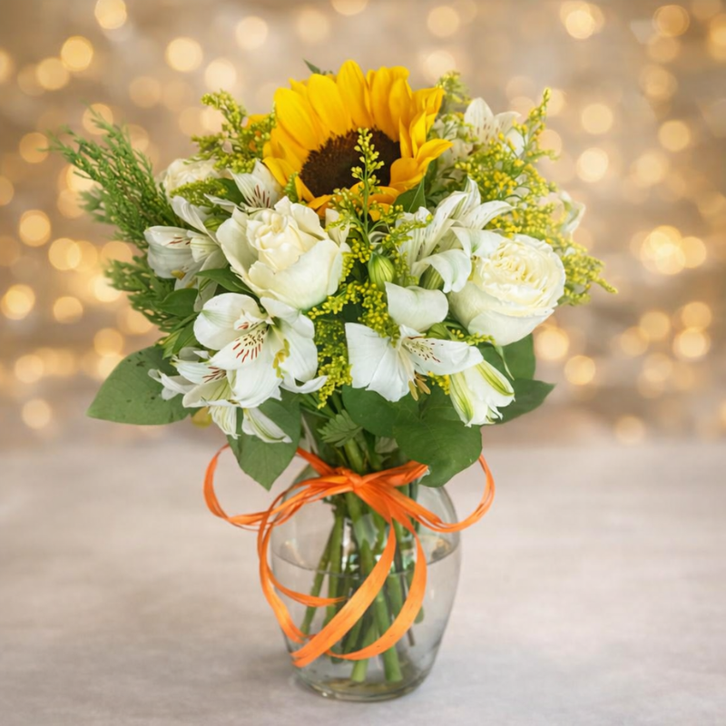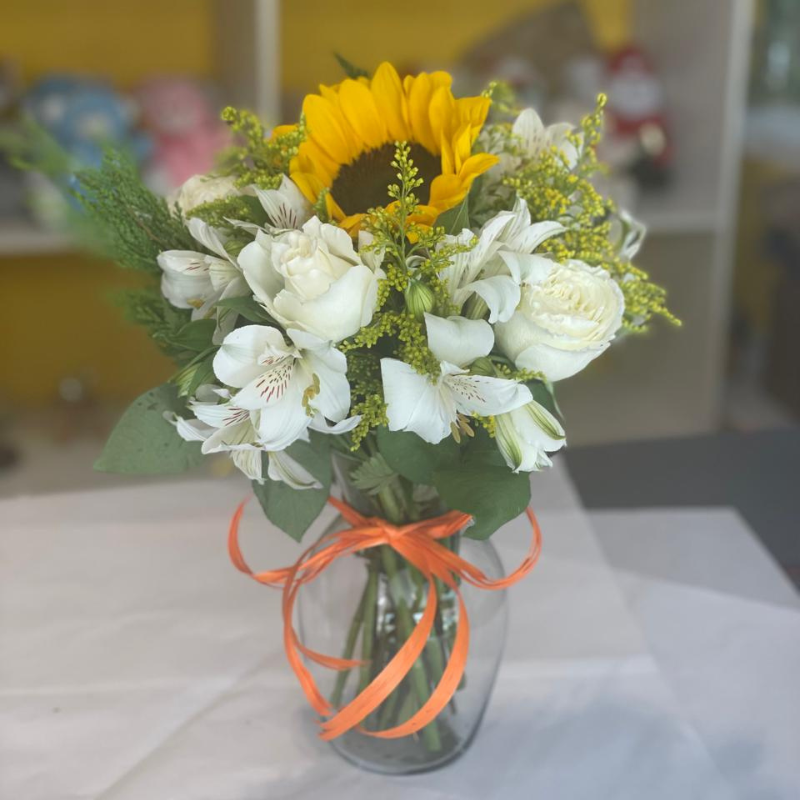 Arranjo Girassol com Rosas Brancas