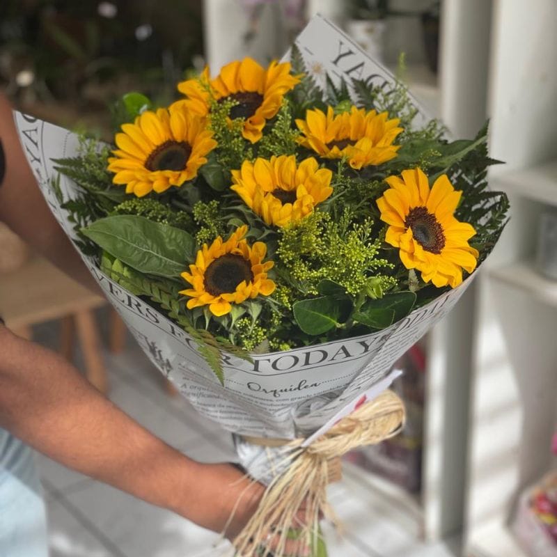 O amarelo intenso dos girassóis ilumina qualquer ambiente e transforma momentos simples em ocasiões inesquecíveis. Para destacar ainda mais o charme do presente, embalamos o buquê em papel moderno com acabamento em corda de sisal, unindo sofisticação e delicadeza.