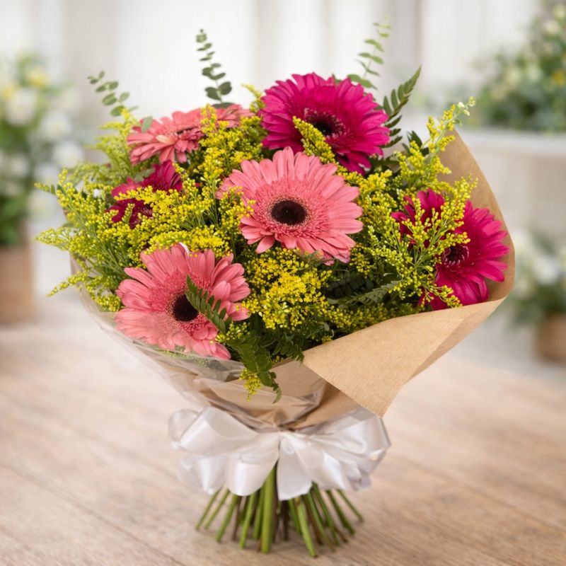 O Buquê de Gérberas é uma escolha alegre, vibrante e cheia de significado, perfeito para transmitir carinho, gratidão e boas energias. Composto por 6 gérberas frescas, cuidadosamente selecionadas, e folhagens verdes que trazem leveza e harmonia ao conjunto.