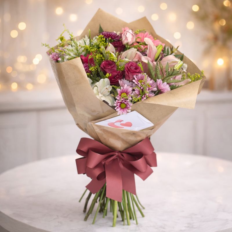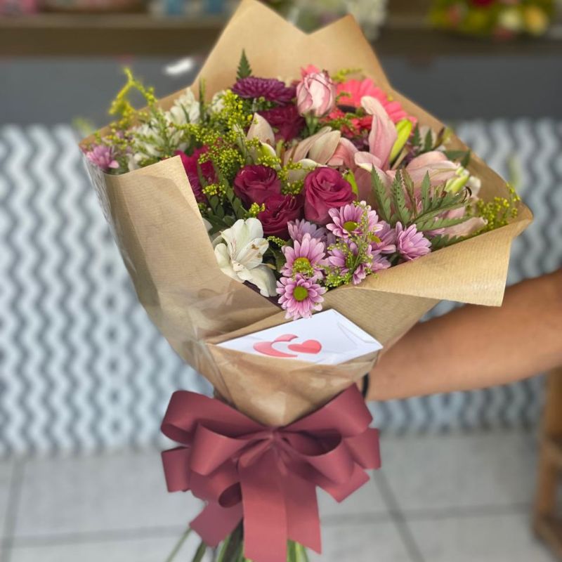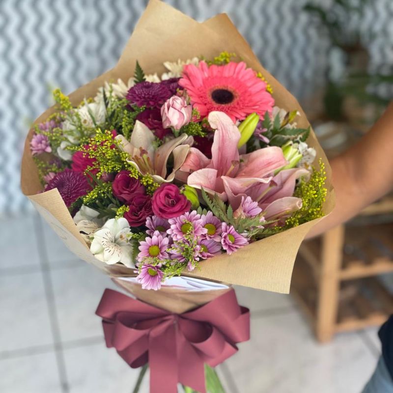 Montado artesanalmente por nossos floristas, o buquê combina flores como rosas, lírios, alstroemérias, crisântemos e folhagens, cuidadosamente embaladas em papel kraft sofisticado e finalizadas com um laço elegante, garantindo um visual moderno e acolhedor.