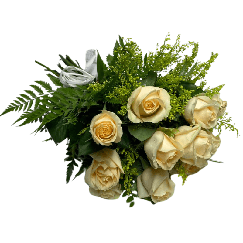 Charme e simplicidade neste buquê com 12 rosas champanhe decorado com um laço.