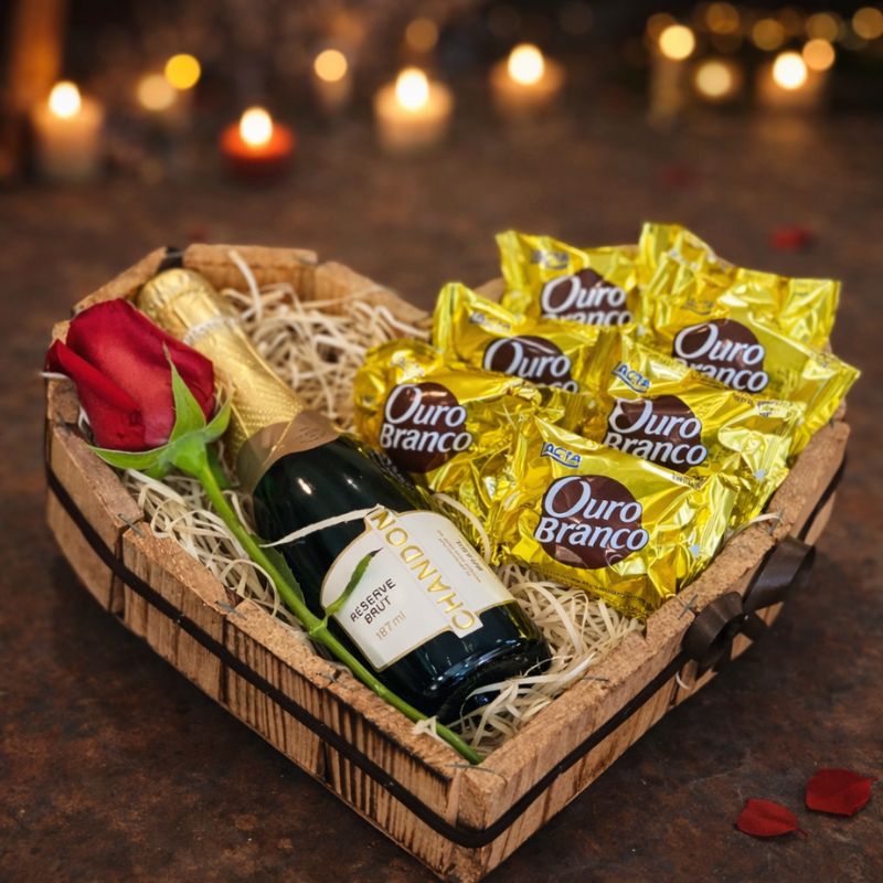 A cesta é composta por uma garrafa de Espumante Chandon Baby, cuidadosamente acomodada em uma charmosa cesta de madeira em formato de coração, acompanhada de deliciosos bombons Ouro Branco e uma rosa vermelha natural, símbolo clássico do amor e da paixão.