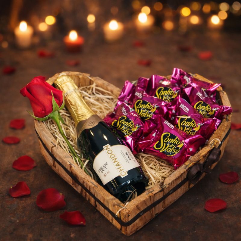 A cesta é composta por uma garrafa de Espumante Chandon Baby, cuidadosamente acomodada em uma charmosa cesta de madeira em formato de coração, acompanhada de deliciosos bombons Sonho de Valsa e uma rosa vermelha natural, símbolo clássico do amor e da paixão.